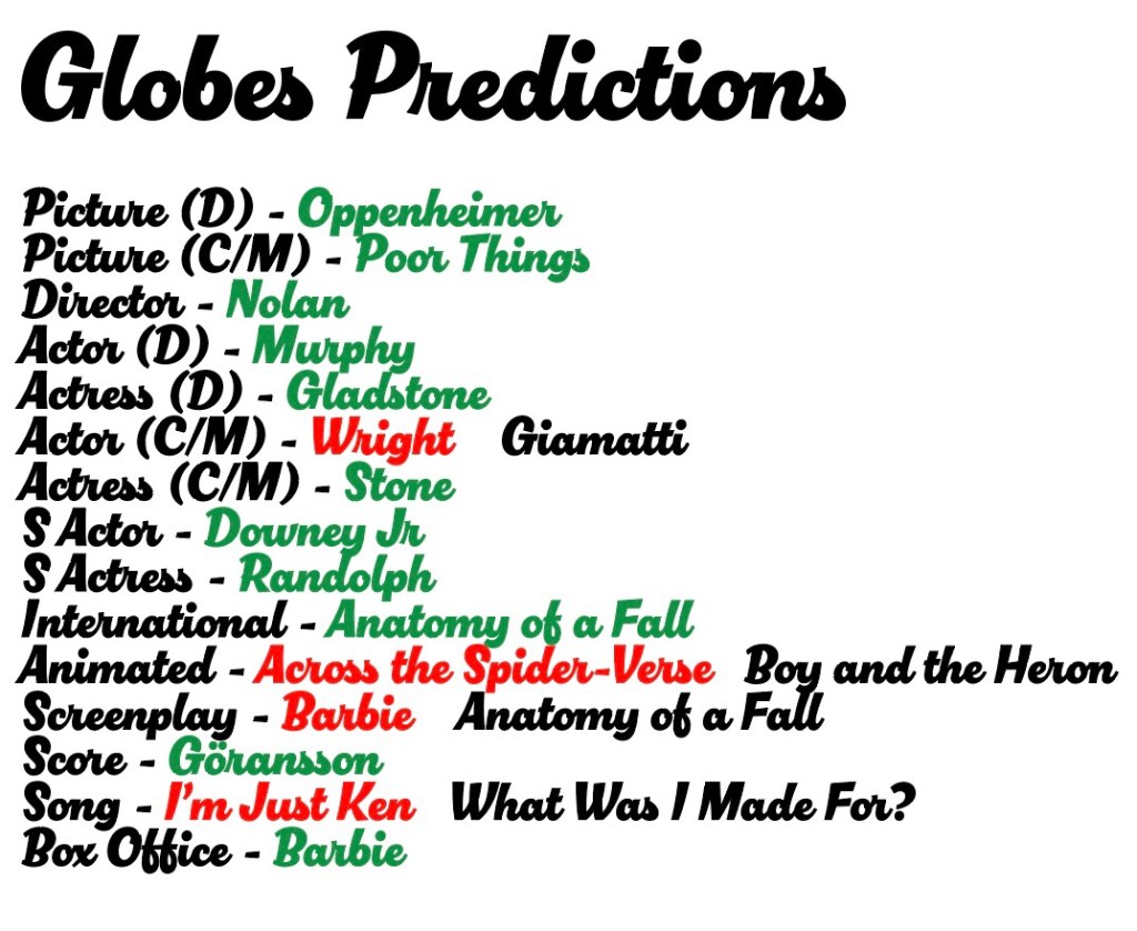 This year’s Golden Globes awards are now in the past, so it is time to see how I did in my predictions. Admittedly, most of the the picks weren’t hard to guess. Oppenheimer is going to win a lot of awards between now and the Oscars in March. With Boy and the Heron winning Best Animated, it gives Studio Ghilbi their first Globe. So that is something. Also, it was nice to see Anatomy of a Fall win Best Screenplay. Overall, 11-4 on my picks, but I have to think the picks for the Oscars will be harder to make. Those nominations will be announced in two weeks on the 25th.