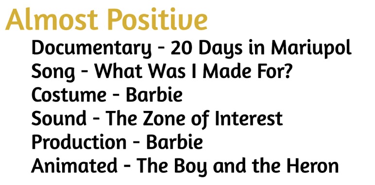 For this group, I am just about in slam dunk territory, but these are written in pencil rather than ink. What if Oppenheimer somehow upsets Interest for Sound? What if Spidey upsets Miyazaki? Barbie should win Costume and Production, but Killers of the Flower Moon is lurking. Possibly too the Academy just feels “I’m Just Ken” more than Eilish’s moody Barbie song which keep picking up wins.