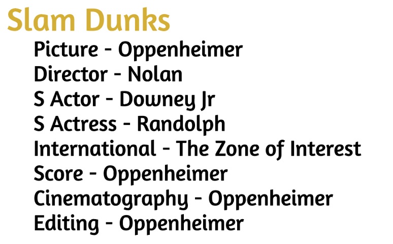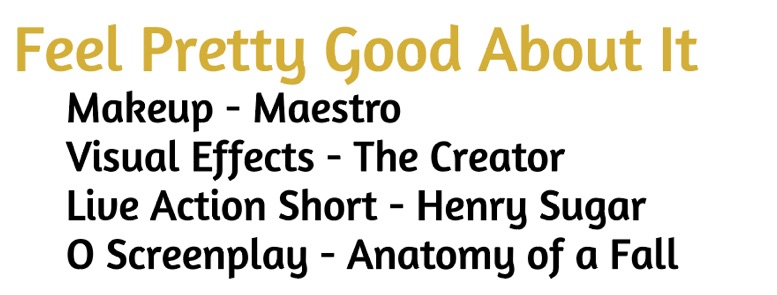 So, on Sunday I try to beat my previous high of 18/23 from 2021. Also, after watching Dune: Part 2 recently, I’m partly glad it got pushed back so I didn’t have to pick between that and Oppenheimer on the below the line awards. It will have its turn to dominate next March.