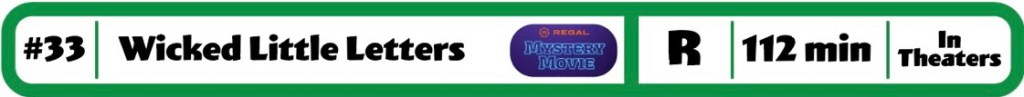 For the first time in on of these Mystery Mondays, I was completely surprised when the movie started. That being said, it was a pleasant surprise. This was a pretty good British black comedy about a true scandal 1920’s England. The story centers on neighbors played by Olivia Coleman and Jessie Buckley, and the letters in the title that earn the film the R rating pretty easily. This might not really work for people who don’t find British comedies funny, but that isn’t really an issue for me. The level of humor in this is comparable to Banshees of Inisherin. There isn’t many laugh out loud moments in this, and there is some heavy drama mixed in, but it is a continuously enjoyable time.