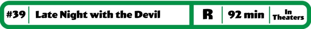 Horror movies are not my thing. It really has to look interesting for me to attempt to sit through it. This one did, and for the most part I enjoyed it. This film is about a late night talk show trying to beat Carson’s Tonight Show in the ratings. During sweeps week, they decide to go big on a Halloween show by having a girl possessed by demon on as a guest. Bad things ensue. The film is presented like you are watching a recording of the show from the 70’s, with behind the scene parts added during the show’s commercial breaks to show things are starting to go off the rails. It is a methodical push to the climax when everything goes so poorly for everyone. It isn’t a spoiler to say people die, and how they do is interesting. What keeps this from going too high in the rankings is what happens in the last 5 minutes or so. The demonic girl has wreak havoc in the studio, and the show host played by David Dastmalchain is making his exit from the studio. That is where the movie should have ended in my opinion. Instead, we get a few more minutes of some stuff that really didn’t need to be there. Ending right after things went really bad would have been a great way to end the movie since that would have been when the show would have gone off the TV. Still, it was a good 90 minutes that worked most of the time, and I made it all the way to the end. That is a win for me.