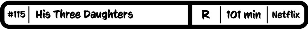 I really wanted to like this more than I did. Th plot can be told in one sentence: Three daughters gather at their father’s apartment as he is in his final days. Those three daughters were played by Carrie Coon, Elizabeth Olsen, and Natasha Lyonne. They are all excellent in their roles as they play three very different characters. Coon’s Katie is I think the oldest one, and the controlling one. Olsen’s Christina is the middle daughter, the kind of spacey one, but the most normal of the three. Finally, Lyonne’s Rachel is the step daughter, the youngest, and the one who lives with their father. There are conflicts between the three, like Katie not wanting Rachel to smoke marijuana in the house. It takes Rachel’s boyfriend sticking up for her for Katie mainly to see that Rachel is more than a leech on their father. What follows is a really nice part of the three coming together. We never leave the apartment or the bench outside the building, so we are always in the story. The issue I had was the same I have for a lot of films: it was too long. By not leaving the “bubble” you leave the story to always needing to do something. We know their father is going to die by the end of the film. They even make a joke about how long he is holding on. I think we could cut 15 minutes out here or there (maybe one or two of Rachel’s scenes smoking outside) and the film would be a tight 90 minutes, and excellent. Overall, this is a really good character movie that is not going to excite anyone, but that isn’t why it’s here.