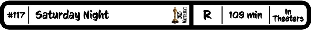 There are two big reasons why I am so high on this film. The first is the pacing. Framed as the 90 minutes leading up to going live for the first time, our soundtrack is a ticking clock or sound checks for the musical guests. That ticking adds to the tension of the film. That is the magic trick to this one. Everyone going in to the film knows they make it to air, but the film made me question that a little. The bigger reason I love this film is the cast. There are no weak spots to the ensemble. While everyone is good, there are a few that stood out to me. I’m reading a lot loved Corey Michael Smith as Chevy, but I thought Dylan O’Brien was scary good as Aykroyd. Gabriel Luna continues his hot acting start as Lorne, and he really carries the movie like he is supposed to. Also, Tommy Dewey as O’Donoghue had some of the best moments. Finally, how JK Simmons plays Milton Berle is kind of fun when you know he will be banned after his only hosting spot in 1979.