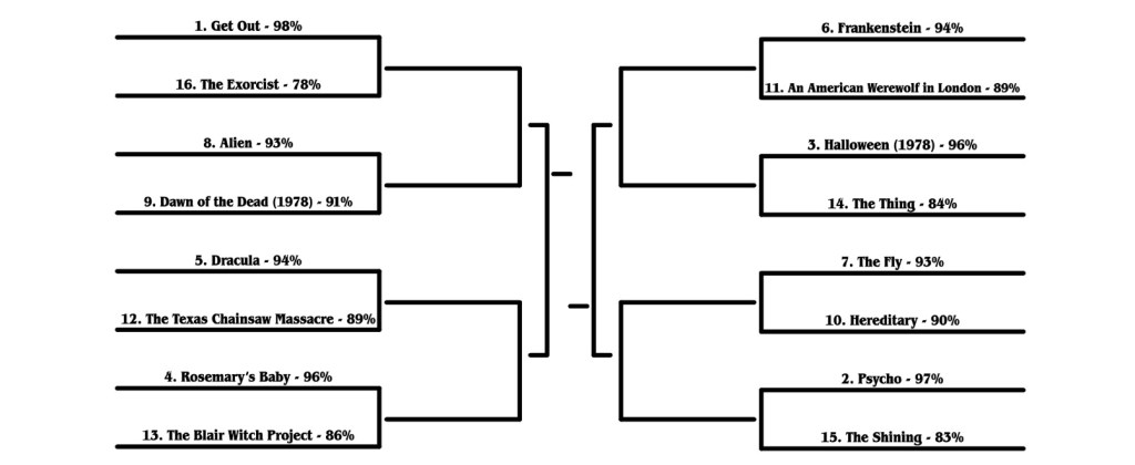 For this 7th tournament, I went with the obvious theme, Horror Movies. It’s October. Sometimes the themes pick themselves. How the 16 films were seeded this time was through Rotton Tomato scores. We are dealing with a 87 year timespan between Dracula and Hereditary, so box office number are pointless due to inflation. So, what does the bracket look like this time.