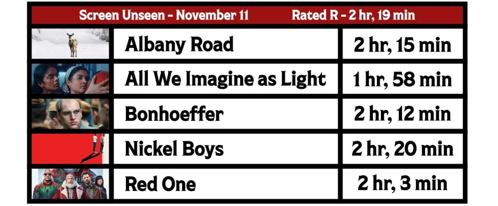 To start, on Sunday (the day before SU) AMC has an early showing of Red One, so the chances of that being the mystery movie is slim. All We Imagine As Light is 20 minutes under the target, so it might be too short. Nickel Boys (which I’ve already seen) is one minute off, but it’s almost 30 days away from its release date. That leaves two options for me. Of the two, I’ve never seen anything about Albany Road. Bonhoeffer, on the other hand, has had a trailer in front of many of the smaller films I have seen recently. It just feels like a Screen Unseen film, kind of like One Life was. So, I will go for that one as my guess.