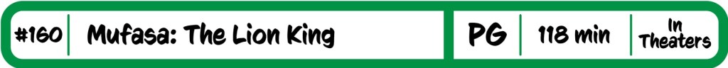 If they were so hell bent on making another one of these, why not do adapt Lion King 2: Simba’s Pride, or I don’t know, tell a new story with these characters? One thing I am reminded with this is that in the 2000’s Disney was toying with a Snow White prequel called The Seven Dwarves, which was rightly cancelled. In that we would have learned so much about the dwarves including that Dopey lost his voice witnessing his mother’s death. We didn’t need to see that, and we didn’t have to since it was cancelled as part of the changes when Disney bought Pixar. The same critical look should have been placed on Mufasa. There is a line from Jurassic Park the applies here spoken by the great Dr. Ian Malcolm: “Your scientists were so preoccupied with whether or not they could, they didn’t stop to think if they should.” Anyway, the next Disney release is live action Snow White, so get ready for me to get on my soapbox again.
