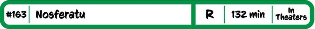 Robert Eggers is on a short list of directors that I will be there for every time. His first three films are excellent, and I will defend the greatness of The Northman to any that challenge it. So, when I learned his fourth feature was going to be a remake of a more than 100 year old film, I was locked in. The 1922 film Nosferatu is a great film. The German silent film was based on Bram Stoker’s Dracula, and preceded Universal’s iconic 1931 Dracula film. So, going into this one, those that know cinematic history knew what we were going to get. While the story is pretty close to the 1922 film, there are some improvements that are evident here. The obvious one is sound and dialogue, but that is an easy one. What really works here is the way Eggers filmed the story. There is a feeling for dread and fear that just grows as the film goes on. I wouldn’t say this is a scary film per se, but this also isn’t a fun one. It’s just hard for me to describe the look of Eggers films, but it really works for me. Lighting really sets the mood in his films, and in this one, I don’t think we get a colorful shot until towards the end of the movie. Just a lot of candlelit rooms and shadows. Exactly what you are looking for when you go into this kind of film. While I don’t think this reaches the highs of The Northman for me, this is still a great film that will be in the top end of my rankings for the year.