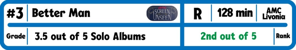 What you do need is gimmick that works, and William’s decision to portray himself as the “dancing monkey for your amusement” that he views himself at times. This isn’t a family movie like Showman was. Lots of swearing, some unnecessary nudity, more adult situations, and not a lot of happy, fun sequences should keep some people away. I get it, but sometimes we need swings like this. If Williams played this character straight, it would have been a borderline forgettable affair. I might be for some anyway, but this way an enjoyable time for me. I am also happy this is out in theater finally, as I am growing tired of the trailer being played everytime. Now I just wait for Companion and Flight Risk to come out. Those trailers are getting old too.