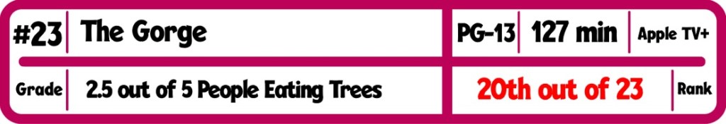 We have not had too many great Apple TV+ original films. Yes, CODA did win the 2022 Best Picture. There is also Napoleon, Killers of the Flower Moon, and I will argue for Spirited. On the other side there is lot of mediocre to bad films released by Apple. The Gorge is in that second group. Directed by Scott Derrickson in between The Black Phone entries, this film is about two elite snipers stationed on opposite sides of the titular Gorge. They have to both not communicate with the other side, and keep what ever is in the gorge from coming out. This is a movie and not a documentary, so when you cast Miles Teller and Anya Taylor-Joy, you know they are going to talk to each other, and develop feeling for each other. As the plot demands, the two find themselves in the gorge eventually, and what we see down there is certainly something. It is just a never ending slog through a CGI wasteland filled with plant people and other weird creatures. I just felt bored through most of this film and that was the problem. The action scenes had little to no stakes as I know our leads are going to be fine. I’m just curious how much money it took to get Teller and Taylor-Joy to do this film. The bulk of the budget had to be used on the CGI mess, and there isn’t much more to the film outside of that. This was just a waste of two hours that has become commonplace with Apple releases. Maybe they should focus on better projects in the future rather than dumping money into projects that might not return the investment. F1 is the next one for the studio un June, and the budget for that is said to be massive. Hopefully it all comes together for that one. It certainly didn’t for this one.