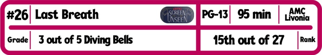To set the parameters of this, Last Breath is a true story that is a feature film remake of a 2019 documentary, and both this and the doc are directed by the same person (Alex Parkinson). So, you should probably know how this movie ends when you walk into the theater. Our subject is Chris Lemons, part of a diver team in the North Sea who makes repairs to pipelines 100 meters under the sea. On one of these jobs, there was an incident where the support ship on the surface lost control and in the chaos, Chris was cut off from the ship, leaving him stranded with no heat or power, and with 10 minutes on a backup breathable gas tank. After the ship is fixed and back in position for a rescue, Chis had been without oxygen for 30 minutes. Miraculously, he lived with no lasting issues. Watching the film, you see this unfold and think this is a little fantastical. Then you remember this is based on doc, and that 30 minute window was real. That level of tension leading up to the rescue is definitely there, but my issue with the film is we spent too much time in the first act leading up to the main plot. Chris (played by Finn Cole) is joined on his team by Duncan Allocock (Woody Harrelson) and David Yuasa (Simu Liu), and the casting of the team is fine. Overall, this an interesting film, but really, why not watch the actual documentary instead? With these being so close to each other, and filmed by the same director, it might be better to watch the version using real footage instead of the feature film version.