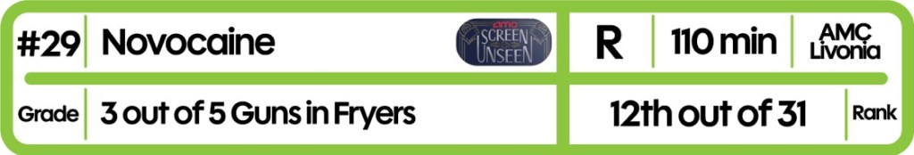 I will preface this with something I have brought up many times before: I am a wimp with gore and uber violence. Usually, I just have to avoid horror movies to not have to go through watching that. Again, I’m a wimp. Going into this, I kind of had a feeling it was going to be that kind of movie. In this, Jack Quaid plays Nathan Caine, a man with a rare disorder that leaves him with the inability to feel pain. That means you can do so many gruesome things to him, and they do. What gives us a plot here is Nathan begins to date a coworker named Sherry, and when a robbery takes place at the bank they work at, Sherry is taken hostage. What Nathan decides to do is chase after them and rescue Sherry. The fight scenes they have for the three big showpieces are very good, and they get more and more violent. That final fight sequence was brutal, and there was something in there that I just couldn’t watch. The sound of both the action and the people around me was enough for me on that. I do have a couple of comments on this that will give the ending away, so I will keep them back for now. Just know I have quibbles with the final 5 minutes. Still, even with my personal problems that I am trying to improve, this was very entertaining movie. You just need to know what you are getting into here. This isn’t a soft R rated film.