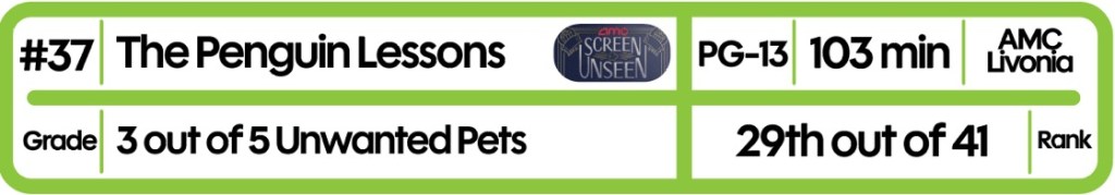 This was a Screen Unseen I thought long and hard about skipping. None of the options were ones that I really wanted to see. But to the theater I went. This film is based on the true story of an English teacher in an Argentina school, who while on break in Uruguay, saves the life of a penguin in an attempt to woo a lady. The penguin refuses to leave his side after that. This film was aggressively fine that is a constant battle between two different tones and focuses that limits the impact of the film. On one side, we have Steve Coogan’s Tom Michell and how his life is changed by the penguin. We see how it allows him to connect with his class, and makes him really a better person. On the other hand, the film is set during the Coups of Argentina where fear and distrust had hold of the area. I get that the events really took place at the same time, but the film, and the score that is the backing of most of the scenes, wants that is to be a fun, playful film about acceptance. Having the tonal shift to drama really derails what the other side is trying to do, and the film doesn’t do a great job of tying the two sides together. What we are left with is a ok movie that could have been a lot better.