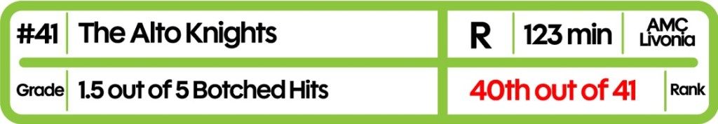 Going in to the weekend, I really wasn’t expecting that the Robert De Niro gangster film would be the one I despised. But here we are. This is the “true story” of two of New York’s organized crime bosses, Frank Costello and Vito Genovese, both played by De Niro for some reason. This was a slug to get through that felt like watching a book report. How this movie works is two or more people will have a conversation dropping exposition, and we will see old pictures about what they are talking about. Either that or De Niro explaining things talking head style like we are watching a documentary. This style the film had made a 2 hour film feel like 4. I counted 5 people leave the theater starting near the middle of the film, and I almost fell asleep a couple times. I’m not sure why De Niro had to play two roles. The character an aren’t related to each other, so they didn’t need to look alike. You could have cast a separate actor as either Frank or Vito, but that wouldn’t save this stinker. This was a huge disappointment.