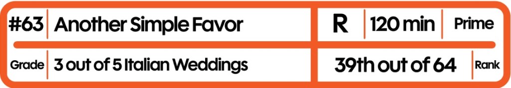 When A Simple Favor came out in 2018, it was fine. I never really thought we would get a sequel to it, but here we are. Paul Feig is back to direct, and Lively, Kendrick, and Golding are all back too. The sequel takes place 5 years after the events in the original, and we find Emily has been released early for the double murder she was convicted for. She tracks down Samantha at a singing of a book she wrote about Emily. Emily then invites/blackmails Samantha to become her maid of honor in a wedding located in Italy. So, away we go to an Italian wedding, where Samantha discovers the groom is a member of the mob. Once people start dying, Samantha has to unravel yet another murder plot. This wasn’t as fun as the first one, and that could be the mystery is gone. The plot twists this time just come off as soap opera like, and silly. Kendrick is her usual self here, but it’s Lively that has more to do, take it or leave it. I will say there something happens that involves Lively’s character that won’t make those thinking she is an egomaniac any quieter. This wasn’t fine, and it is appropriately a streaming movie. It just looks like a film with a limited budget, and most of that went to Lively’s wardrobe probably.