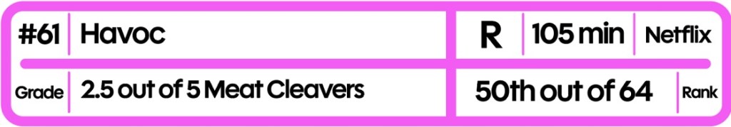 Havoc has had an interesting path to it’s release. Gareth Evans was attached to direct the film in February of 2021. The cast was put together, and filming wrapped in October of that same year. However, reshoots, editing, and the strikes caused the production to be delayed for years. So, 4 years later, it has finally showed up on Netflix. In the film, Tom Hardy plays a corrupt cop named Patrick Walker. He is in debt to a powerful politician, and when that person’s son is in trouble after a drug heist went bad, it is up to Walker to being the son back. For this coming from the direct of The Raid, I was expecting some cool action sequences. I think we only got one, but that one was pretty great in the middle of the film set in a night club where nearly all the characters show up in waves over the sequence. It was a fight that had different waves, and it really worked. Hardy is ok as Walker, but he is really the only character that left any mark for me, and it was barely that. This is also a pretty violent film. When characters die (and most of them do) it is like an entire clip is unloaded into each person. Overkill is the name of the game, and after awhile it became humorous and I don’t think that was Evans’s plan. I think this film cooked a little too long, and what we got was a crazy shoot em up, that only really killed time I could spent some other way.