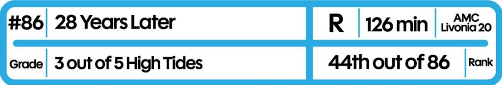 it has been 23 years since Danny Boyle and Alex Garland brought the world 28 Days Later. The excellent flip on the zombie story changed that area of the genre. Five years later, a sequel, 28 Weeks Later, was released without Boyle part of the creation, and it was a good film, but not as good as Days. Now, after over a decade of talking about it, the next installment of this series upon is, with Boyle and Garland pretty much pretending Weeks never happened. Instead, what we have now is a possible 28 Years Later trilogy, starting with this weekend’s installment. When we begin this film, we see the British Isles remain in quarantine to contain the Rage Virus. Our characters live on an island connected to the mainland by only a causeway that is available durning low tide. While out on his first “hunt” with his father, Jamie (Taylor-Johnson), his son Spike (Alfie Williams) sees a fire in the distance. When they return home, he learns that fire is coming from where a doctor is, and Spike decides to take his sick mother, Isla (Comer), to see him. With the infected evolving over time to be more dangerous, the trek to see the doctor (Fiennes) is filled with plights, and there are some good sequences throughout the film. There just isn’t a lot of them as this film is more worried about beginning a trilogy, so the plot is stretched out for 2 hours. One would think that maybe some of the issues I had with this might be answered in January when Part 2 comes out, but that is assuming a lot. I just wanted more than what we got here. Did I want the 12-year old only making his second trip off the island to have more issues? I guess, but my issue was more in the editing. We get cuts to old footage from previous wars cut into he film throughout, and it is just awkward. This is proving to be a polarizing film, so nothing I say here should be taken as the truth. This is going to be a film that will need to find an audience if we are ever going to get that part 3 of this new trilogy.